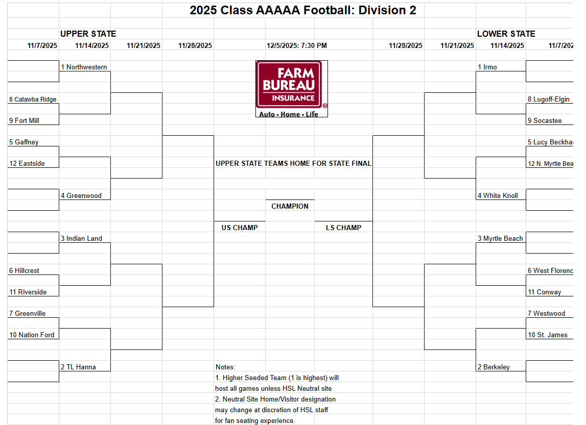 - Northwestern (1), the defending 5A-D2 champ, is lined up to host the Catawba Ridge/Fort Mill winner on Nov. 14.