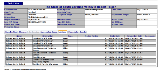 According to the disposed case file, Tolson entered a plea of Nolo Contendere (no contest) on January 5, 2026. In South Carolina, this plea has the same legal effect as a guilty plea for sentencing purposes but allows a defendant to accept the conviction without a factual admission of guilt.