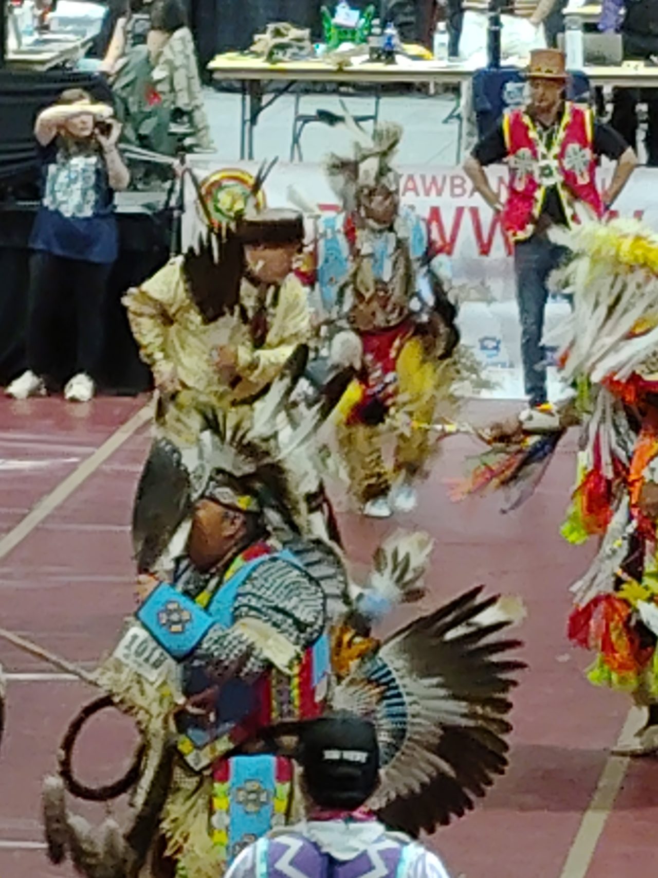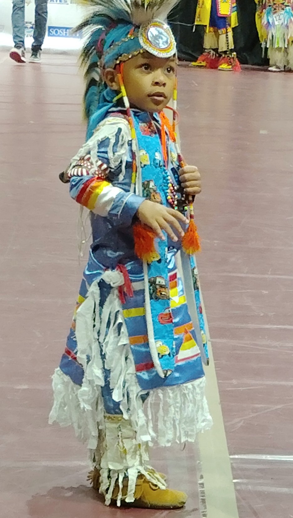 The Pow Wow competition was from tiny tots to seniors and all the other age groups in between. Not only were the dancers footwork competitive but they wore traditional outfits and intricate regala of bright colors. At the beginning of the ceremony they honored the elders and all veterans that were in the Coliseum.